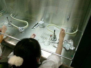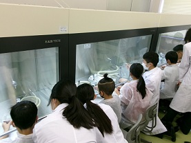 薬業棟にあるバイオ実習室で、無菌操作する際の注意点や培地の作成をしたり、無菌室(クリーンベンチ)でササユリの球根の植え替え作業を