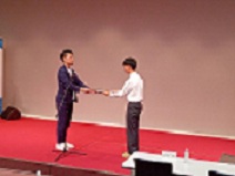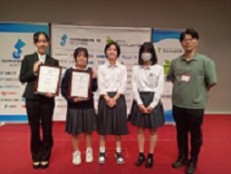 ジュニアリサーチグラントの研究助成に採択され、バイオとかがく系列デジカメ分析班が課題研究として取り組んできた「散乱光デジカメ分光吸光分析」。成果報告会で口頭発表とポスター発表に臨みました。奨励賞をいただき、研究コーチとしてお世話になった立命館大学双見京介講師と記念撮影。