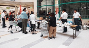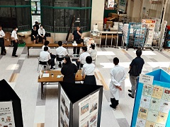 生物と環境系列が育てた農産物をアル・プラザ水口店の正面玄関前で販売し、たくさんのお客様に買っていただきました。生物コースは、甲南卵・チキンカツ弁当・チキンカツサンド・米を販売し、環境コースは、様々な夏野菜・甲南緑茶・花苗を販売しました。次回の同店での販売会は12月を予定しています